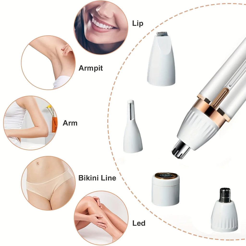 Depilador versátil 4 em 1 com tecnologia de disco para remoção eficaz de pelos em todo o corpo. Equipado com bateria recarregável de longa duração (mais de 90 minutos), funciona tanto em depilação seca quanto úmida. Inclui 3 a 4 cabeçotes intercambiáveis em metal para diferentes áreas: corpo, rosto, sobrancelhas, axilas e linha do biquíni. Marca KEMOKO com certificações RoHS, CE e FCC. Design compacto em ABS, ideal para uso doméstico e portátil. Depilação indolor e prática para toda a família.