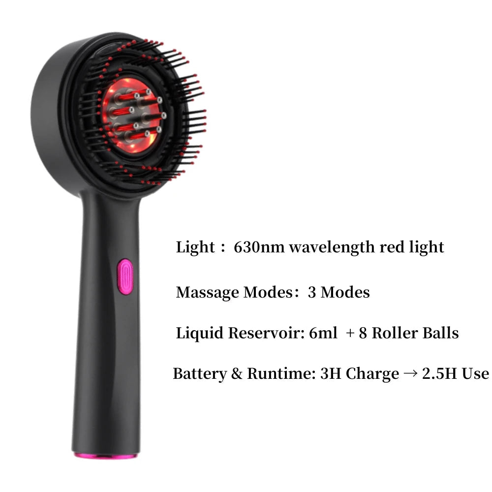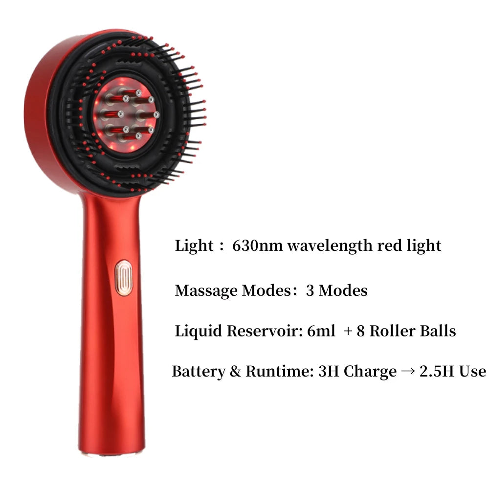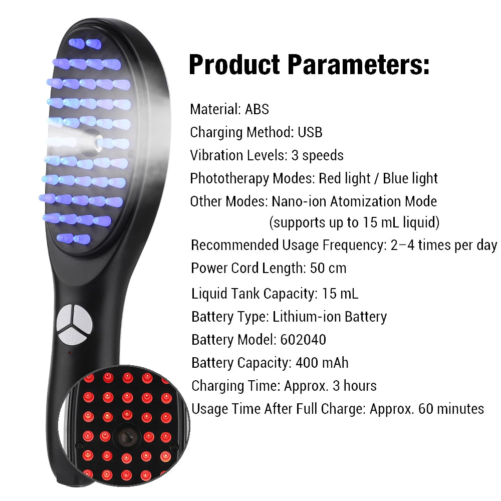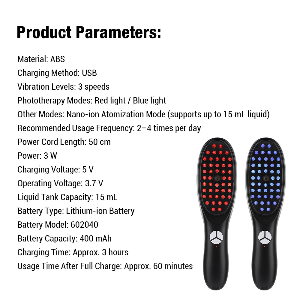 Pente de Massagem Capilar com Luz Vermelha e Azul - Aplicador de Medicamento para Cabelo 6/15ml, Escova Anti-Queda Sem Fio com Grip Ergonômico Revolucione sua rotina de cuidados capilares com este inovador pente massageador elétrico. Equipado com tecnologia de luz vermelha e azul, estimula o couro cabeludo e promove a saúde dos fios. O design cordless oferece liberdade de movimento, enquanto o grip ergonômico garante conforto durante o uso prolongado. Perfeito para quem busca combater queda de cabelo e melhorar a circulação do couro cabeludo, este dispositivo funciona com bateria e combina massagem profunda com fototerapia. Certificado internacionalmente (CE, FCC, RoHS), é fabricado com materiais compostos de alta qualidade. Ideal para uso diário, oferece uma experiência de spa no conforto do seu lar, potencializando a eficácia de medicamentos e tratamentos capilares aplicados diretamente no couro cabeludo.