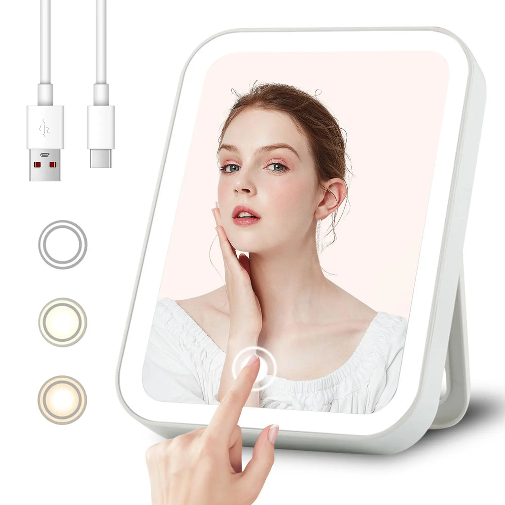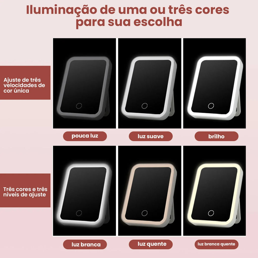 Espelho de maquiagem LED recarregável via USB com design elegante e funcional. Equipado com 3 camadas de espelhos que oferecem diferentes ângulos de visualização para uma aplicação de maquiagem precisa. Conta com tecnologia de toque sensível que permite ajustar facilmente os 3 níveis de iluminação LED, adaptando-se perfeitamente a diferentes ambientes e condições de luz. A bateria recarregável via USB garante praticidade e portabilidade, ideal para uso diário em casa, no trabalho ou em viagens. O fluxo luminoso otimizado proporciona iluminação clara e uniforme, essencial para um acabamento impecável na maquiagem. Design compacto e moderno que complementa qualquer penteadeira ou banheiro, combinando estética com funcionalidade para quem busca qualidade e conveniência.