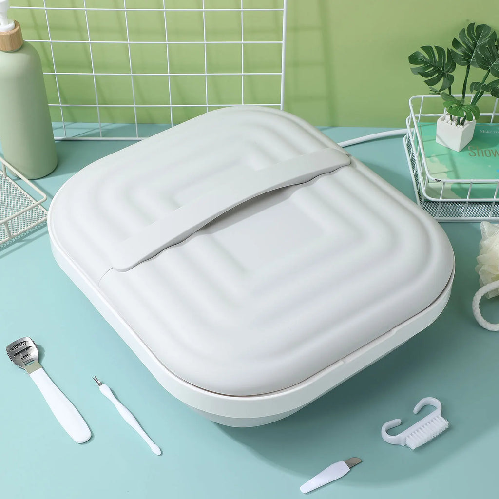 Balde dobrável versátil para banho de pés e spa em casa. Este conjunto inovador combina funcionalidades de aquecimento, massagem e portabilidade em um único produto. Equipado com sistema de aquecimento para água morna, oferece relaxamento profundo dos pés após longos dias. Possui rodas integradas para fácil deslocamento entre ambientes, permitindo usar em qualquer cômodo da casa. O design dobrável economiza espaço quando não está em uso, ideal para quem tem limitações de armazenamento. Inclui massageador integrado que estimula pontos reflexos dos pés, promovendo bem-estar e alívio de tensões. Fabricado com materiais de qualidade, resistente e durável. Vem com plugue padrão EUA. Perfeito para relaxamento pessoal ou presentear quem aprecia cuidados com os pés. Transforme seu banho de pés em uma experiência spa luxuosa no conforto do lar.