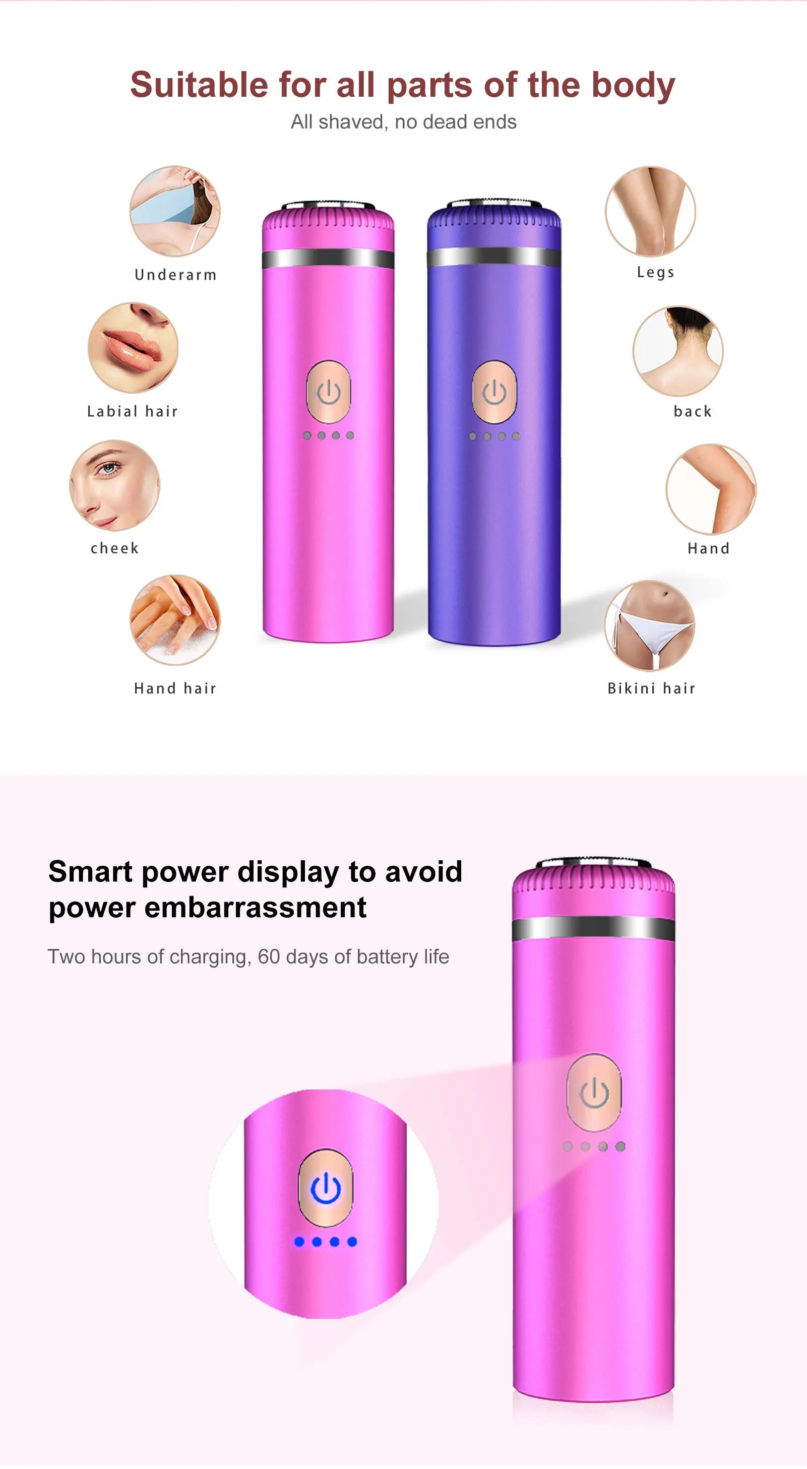 ESPECIFICAÇÕES Tempo de bateria: mais de 90 minutos Tempo de carregamento: até 2 horas Marca: Besidas Certificação: RoHS, CE, FCC Tipo de epilador: Fotoepiladoras Funções: corte seco, corte úmido, cabeça flutuante, carregamento rápido, indicador de carga, luz de fundo Substâncias químicas de preocupação: Nenhuma Tipo de item: Epilador Tipo de bico: Bicos de metal Quantidade de bicos: 1-2 peças Número de velocidades: 1 Origem: China Continental Tipo de energia: Recarregável Uso: Biquíni, corpo, rosto, axilas